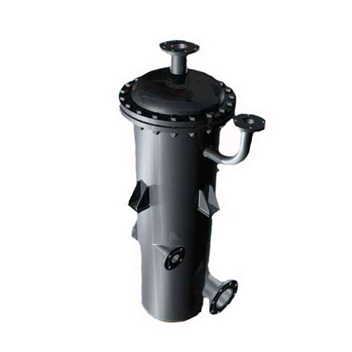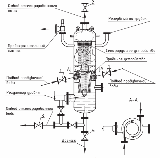 В устройстве сепаратора продувки котла снизу сконструирован приемный узел из двух концентрически размещенных цилиндрических элементов и пары патрубков, приваренных к стенкам по касательной. Его назначение — прием поступающей продувочной воды. В этих моделях сохранение постоянного уровня сепарированной жидкой среды осуществляется автоматически за счет регулятора-уровнемера поплавкового типа, расположенного снизу аппарата. Мониторинг объема отделенной жидкости выполняется комплексом приборов индикации, укомплектованным смотровым стеклом и запорно-регулирующими клапанами.