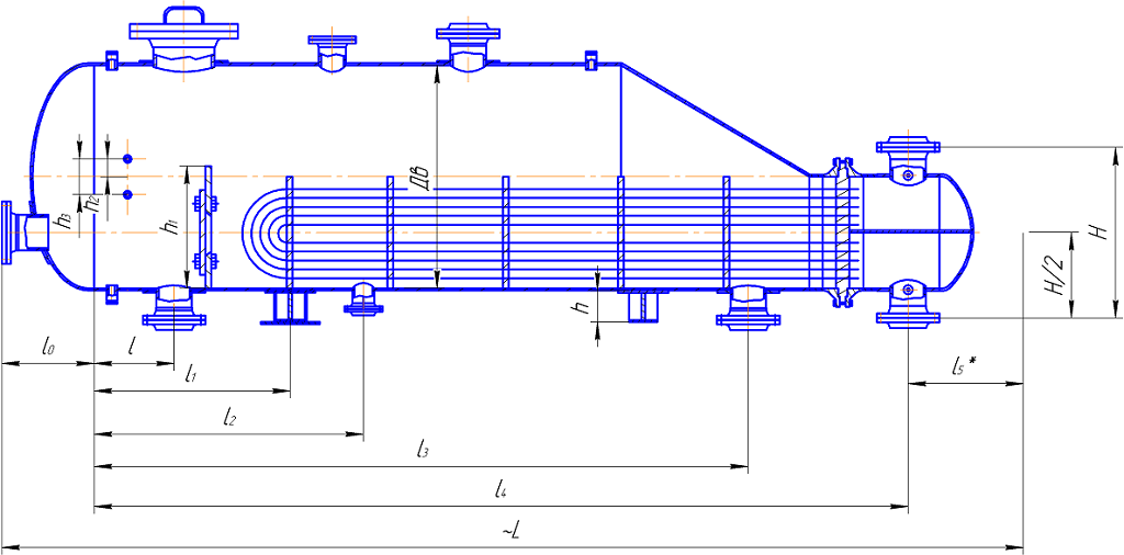 | Внутренний диаметр кожуха | Внутренний диаметр распределительной камеры | Давление, МПа | Н±6 | Н/2±3 | h±3 | h1 | h2 | h3 | ~L | l0 | l±3 | l1±3 | l2±3 | l3±3 | l4±5 | l*5 | А | Ду1 | Ду2 | Ду3 | Ду4 | |