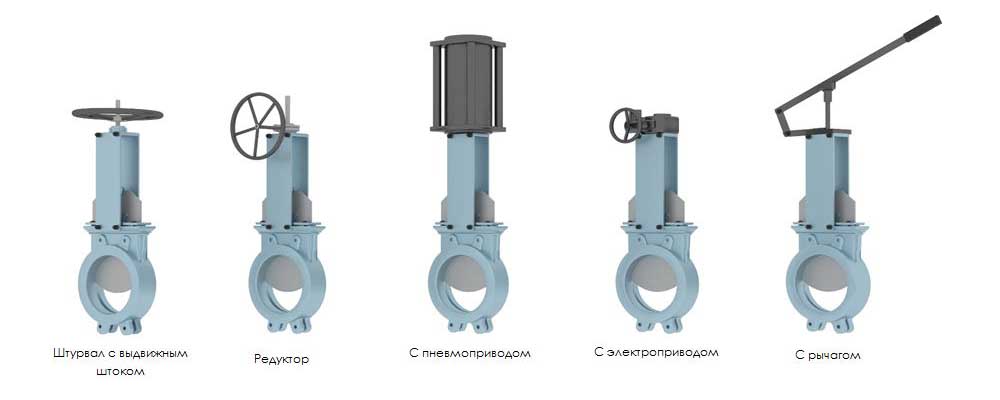 - штурвал DN 50-500 - редуктор DN 50-1200 - пневмопривод, электропривод DN 50-1200 - рычаг DN 50-300 |