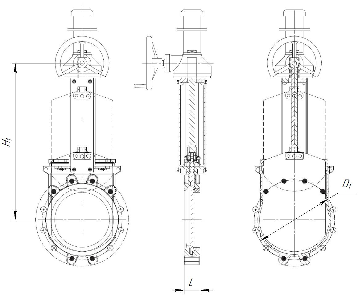 Основные габаритные и присоединительные размеры Шиберных задвижек СНМ 5854 DN50-500 мм со штурвалом